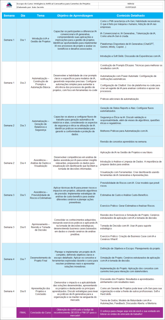 Capacitar profissionais de gestão de projetos com conhecimentos práticos e teóricos sobre Inteligência Artificial (IA), focando em ferramentas no-code para integração de IA generativa e análise preditiva de riscos, melhorando a eficiência e a tomada de decisões em projetos.